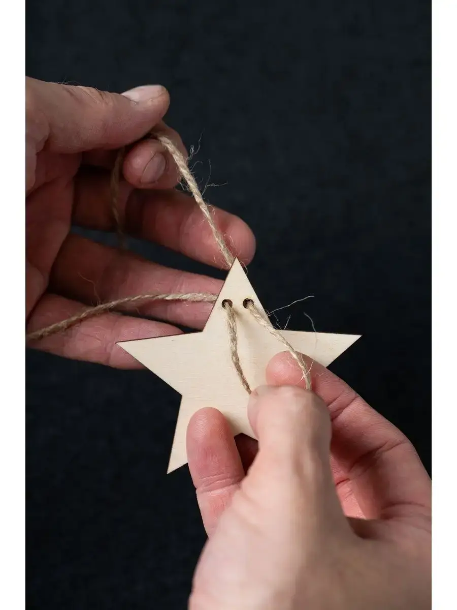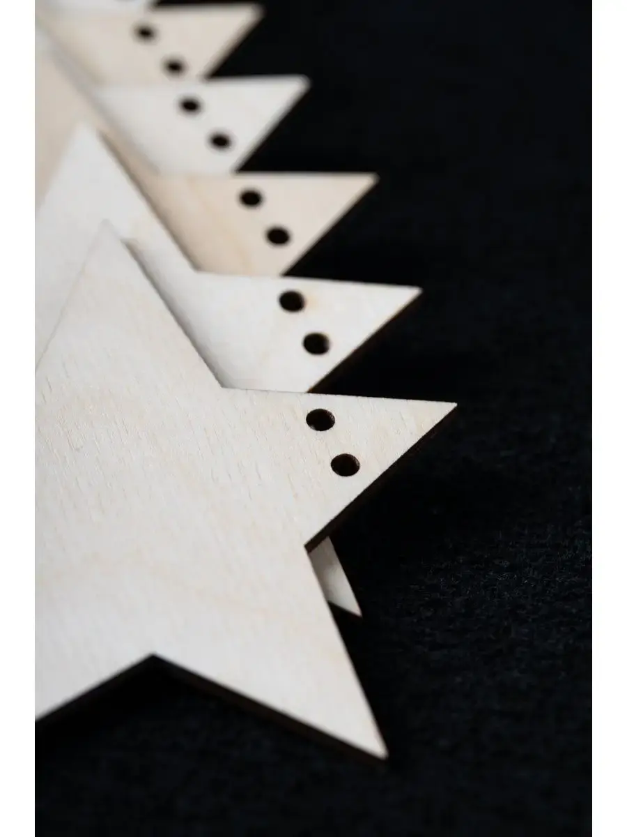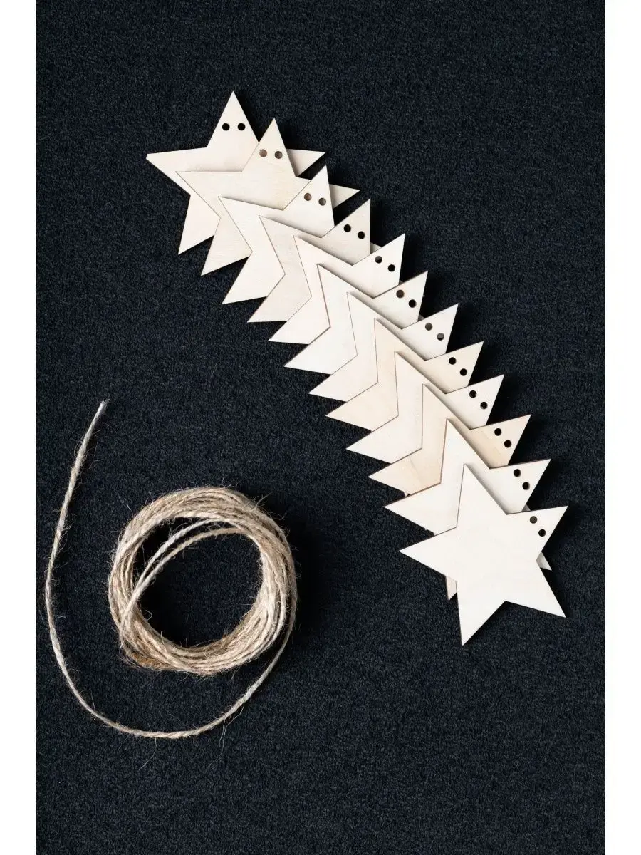 Набор елочных, праздничных украшений на стену или на елку. В комплекте бечёвка длиною 3 метра и 12 деревянных звезд из березы. Диаметр одной звезды 8 см. Каждая звезда имеет два отверстия для крепления нити на ваше усмотрение. Так же звезды можно раскрасить самостоятельно акриловыми красками. подойдет в качестве творческого подарка детям и взрослым. Собирая гирлянду можно весело провести время в любое время года. Наши звезды могут радовать вас не только в Новый год 2023, но и на любой другой праздник и каждый день без повода.